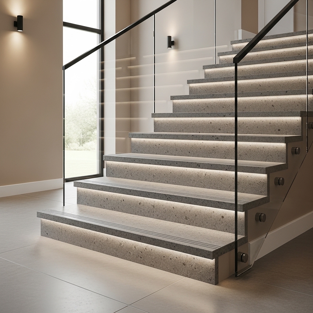 Treads are commonly planned around 20 mm thickness for durability, and a small chamfer or eased edge is specified at the step nose to protect the front edge from chipping.
