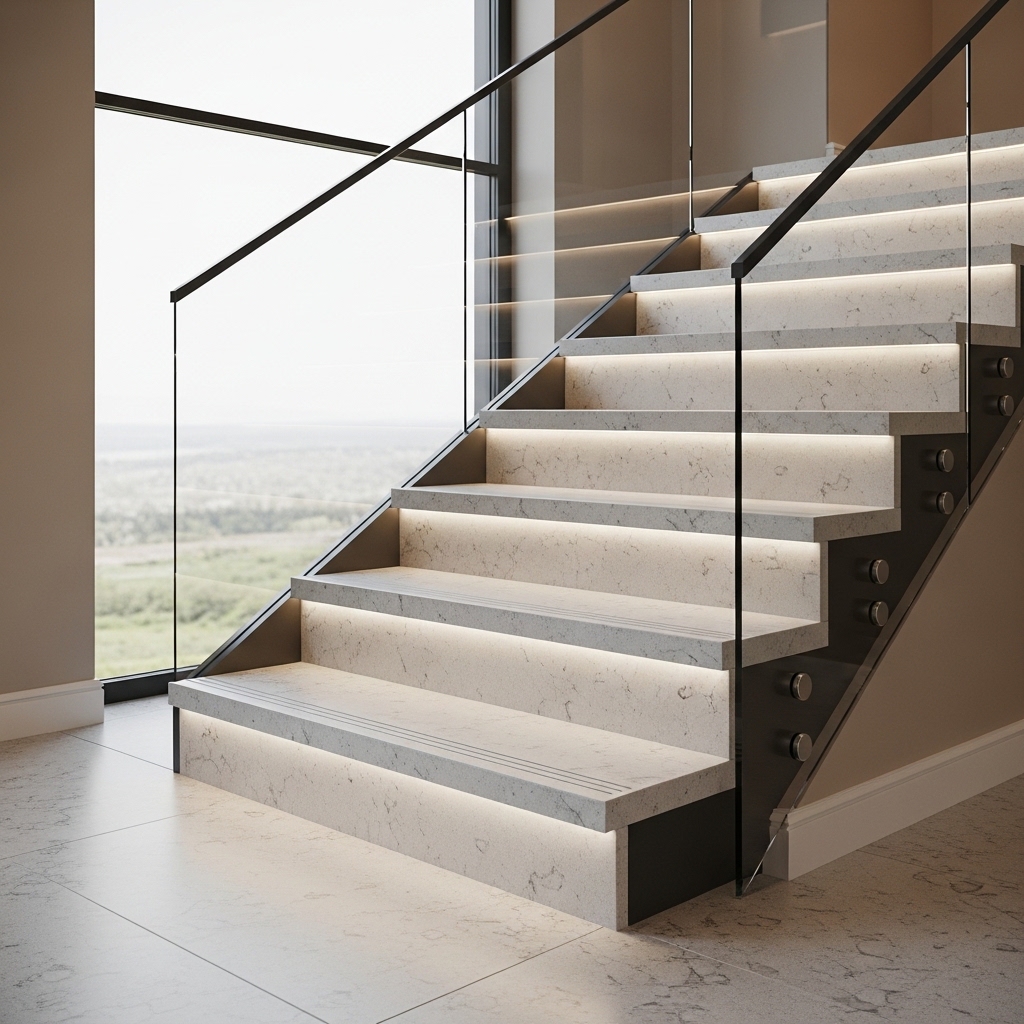 A quartz countertop dimension guide for stairs explains how countertop-grade slabs can be converted into stair treads, risers, and landings while keeping the material look consistent and durable under heavy foot traffic.