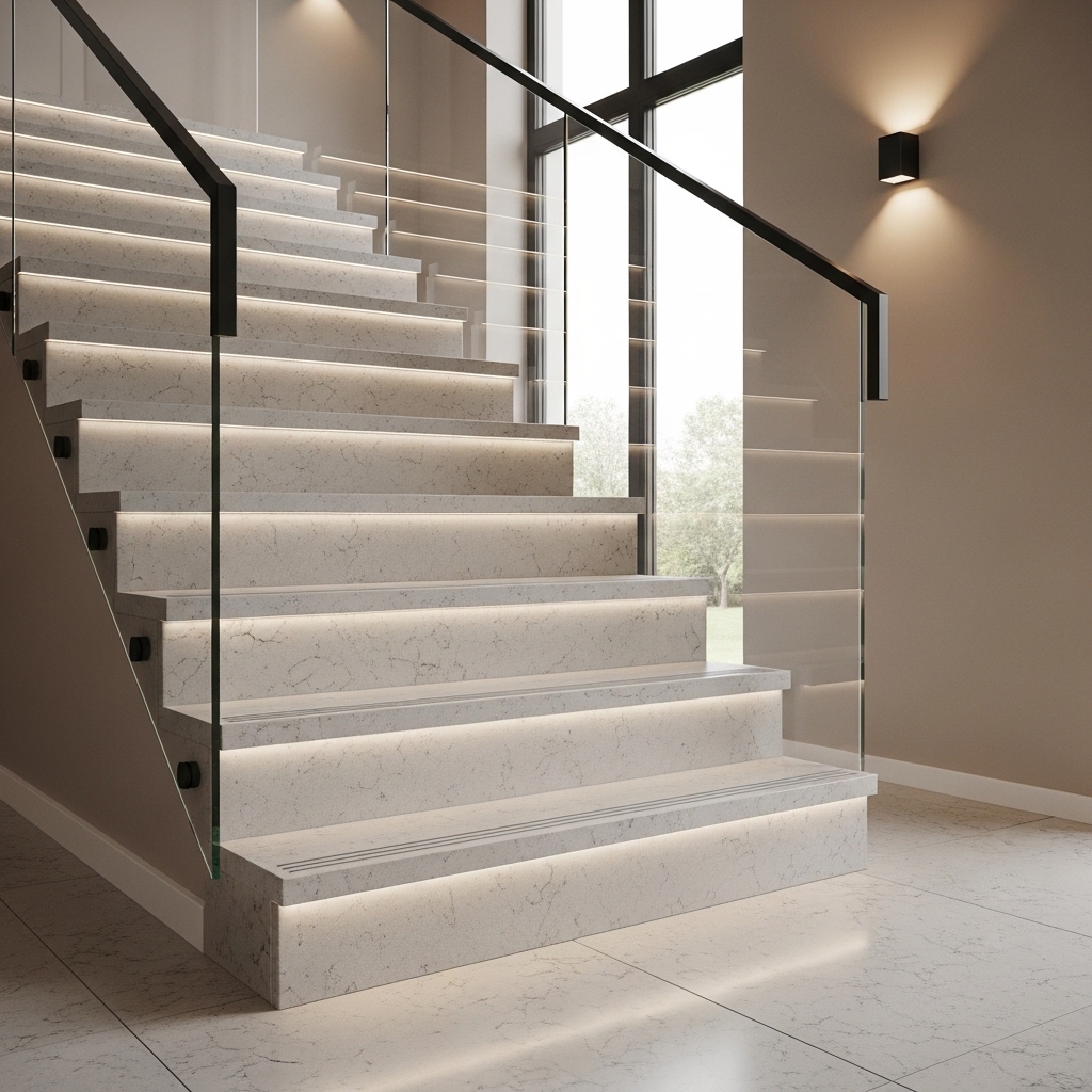 Quartz countertop slab dimensions can translate well to stairs when the goal is consistent material design across kitchens, landings, and adjacent circulation spaces.
