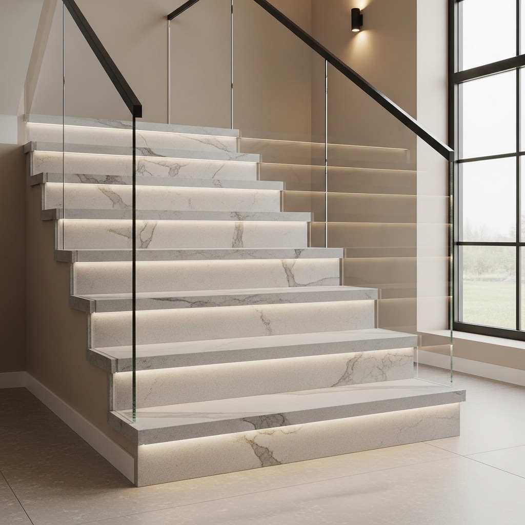 Treads typically use 20 mm thickness, and finishes like matte or honed are often preferred on steps for a more practical feel, with an eased or chamfered nose to reduce chipping risk.