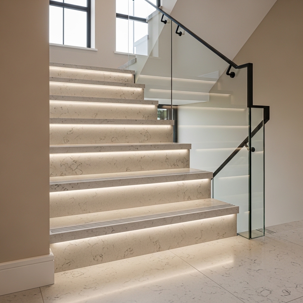 A good plan also considers finish selection—matte or honed treads can feel more practical—while keeping joint spacing uniform so the staircase looks straight and premium.