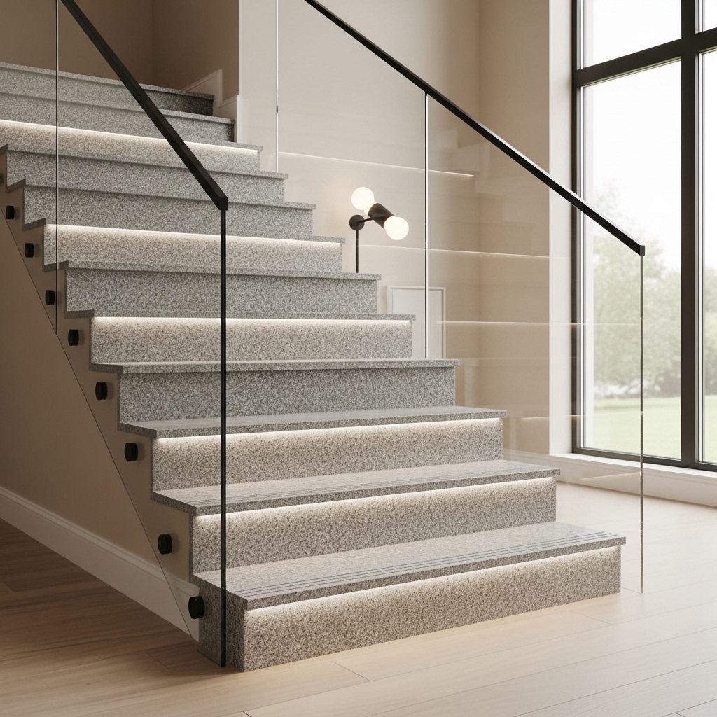 Finish by specifying tread thickness (often 20 mm), a durable step-nose detail (eased or small chamfer), and uniform joint gaps so the staircase installs straight and looks premium.