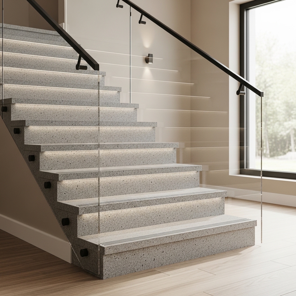 For example, if the kitchen feature surface has a strong vein direction, cutting stair treads in the same orientation keeps the material story consistent rather than changing direction step-to-step.