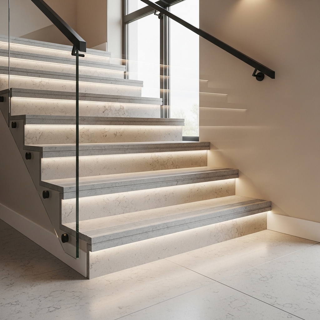 For example, a clean modern staircase may use repeated tread pieces with consistent orientation and minimal joints, while a more dramatic design may sequence veined slabs so the pattern appears to climb the staircase.