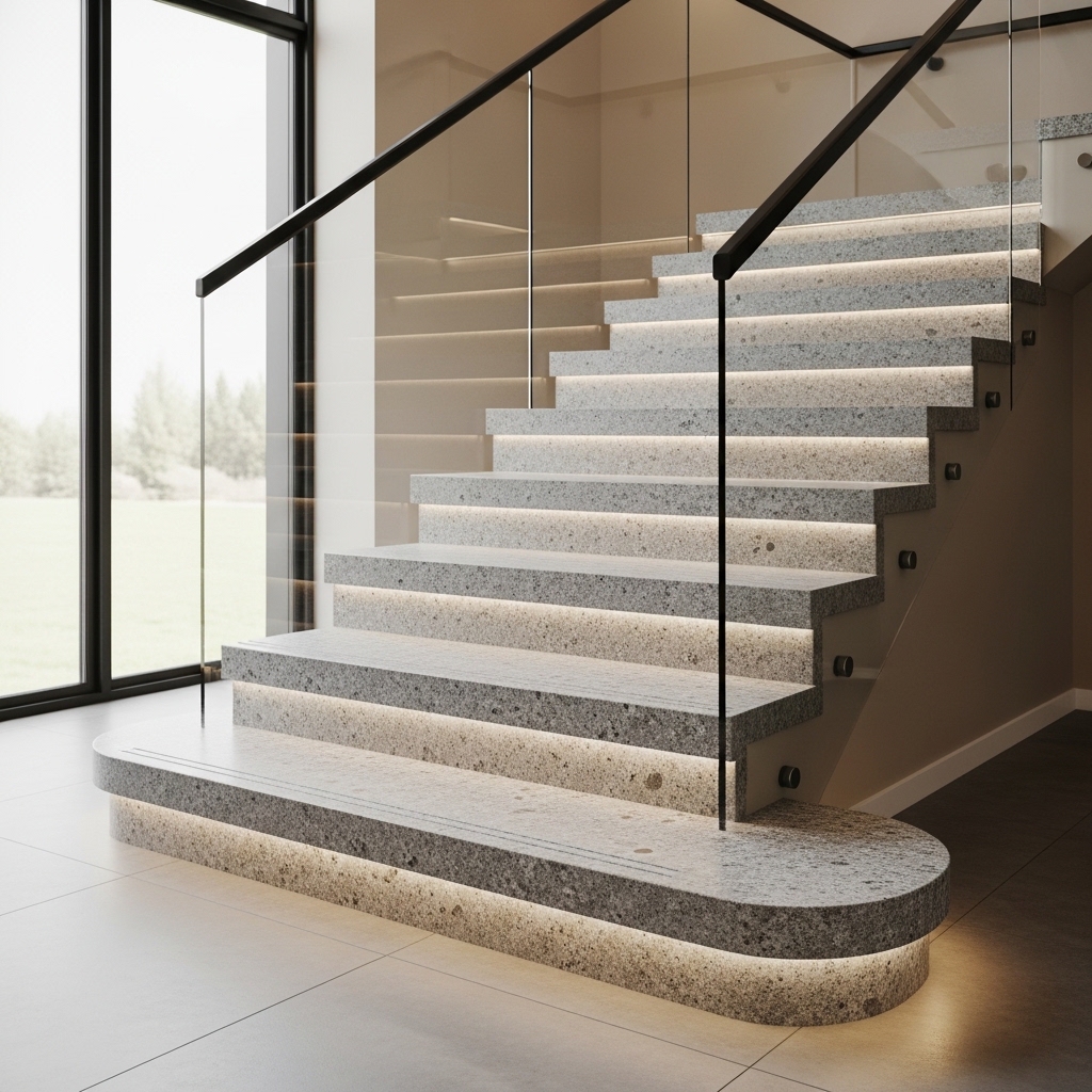 Standard tread thickness is often 20–30 mm depending on design, with an eased or chamfered edge to protect the step nose from chipping.