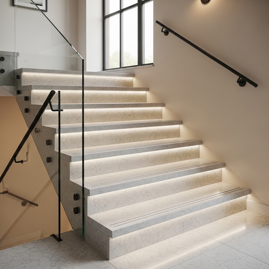 Thickness options often include 20 mm and 30 mm for stair treads, with thicker profiles or built-up noses used when a bolder step edge is desired.