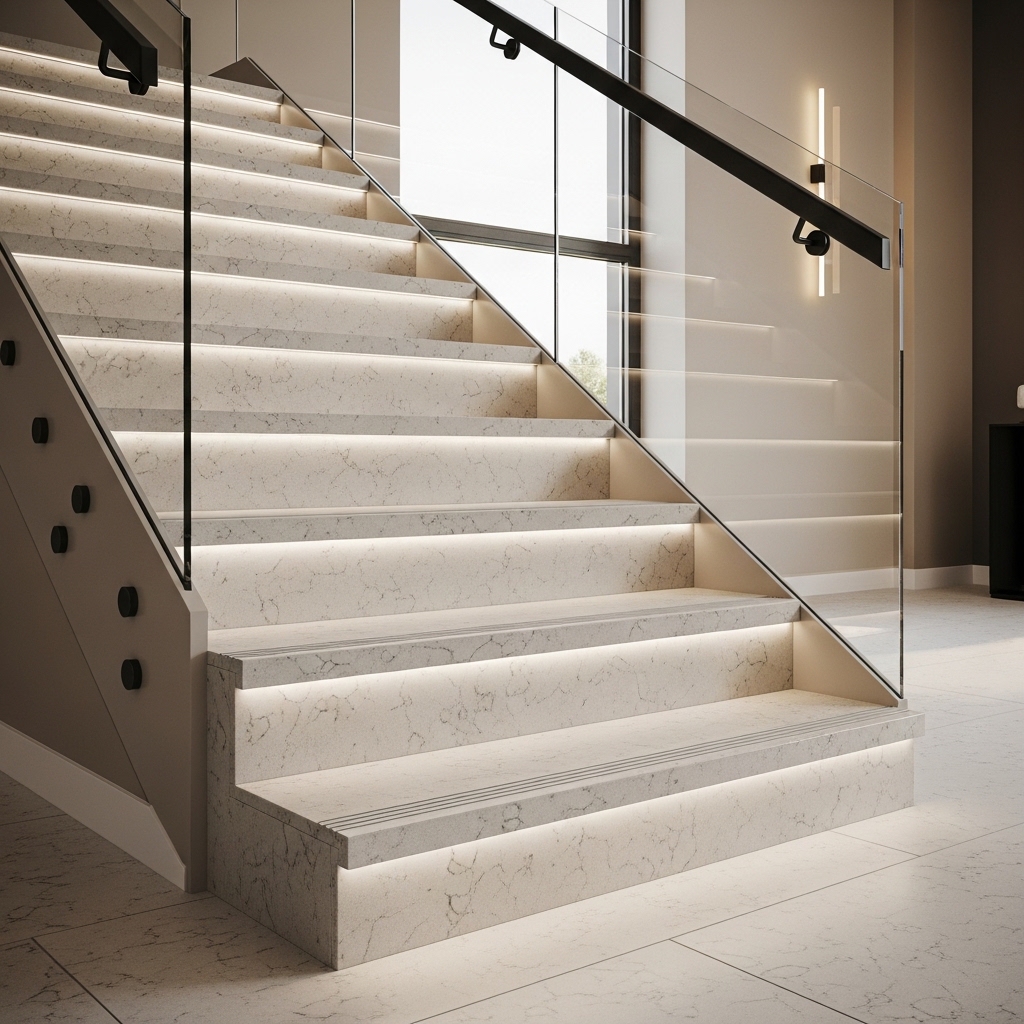 Standard quartz slab measurements are commonly used for stairs because they are widely available and provide predictable cutting yield for repeated tread-and-riser sets.