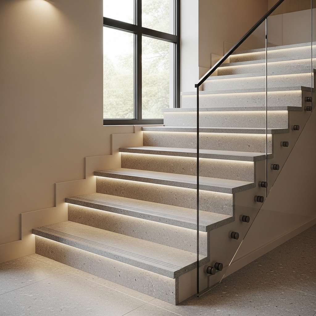 Extra-large quartz slab formats are ideal for stairs when you want fewer seams on wide landings, longer continuous tread runs, and stronger visual continuity on feature staircases.