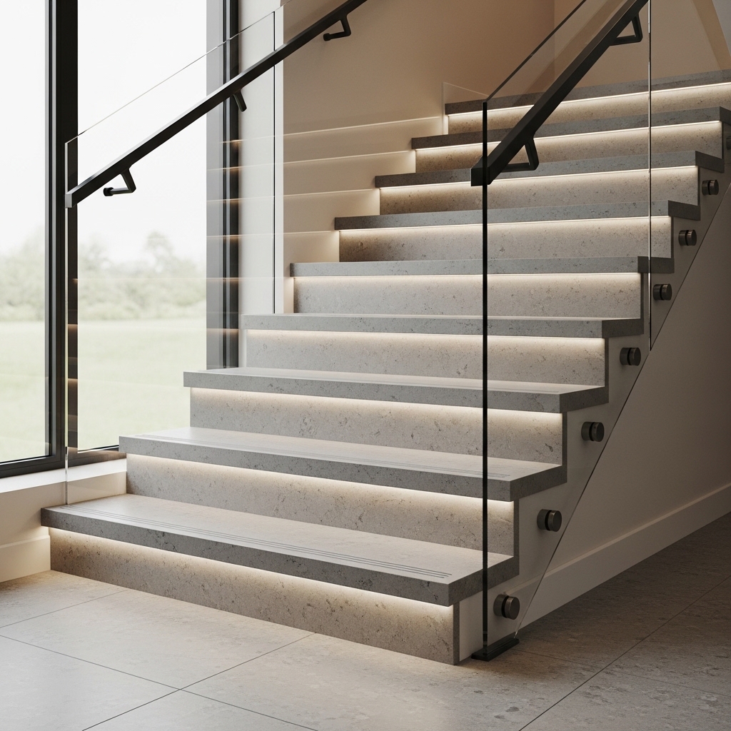 Extra-large slab formats for stairs are used when the goal is maximum continuity—fewer joints on wide landings, longer tread runs, and stronger pattern consistency across the full flight.