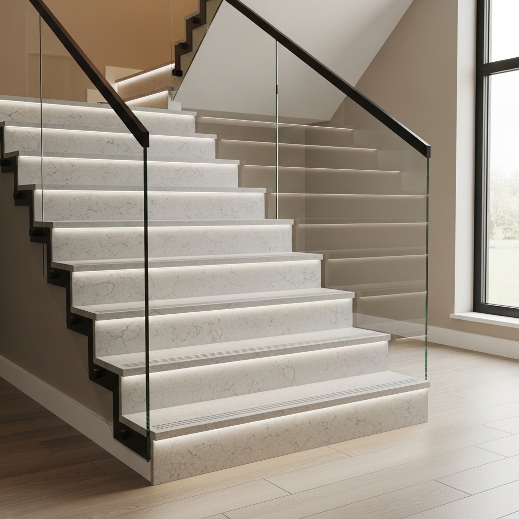 Rather than relying on one fixed size, typical planning selects a slab format that can keep landings more continuous and allows treads to be cut as repeated pieces for a uniform appearance.