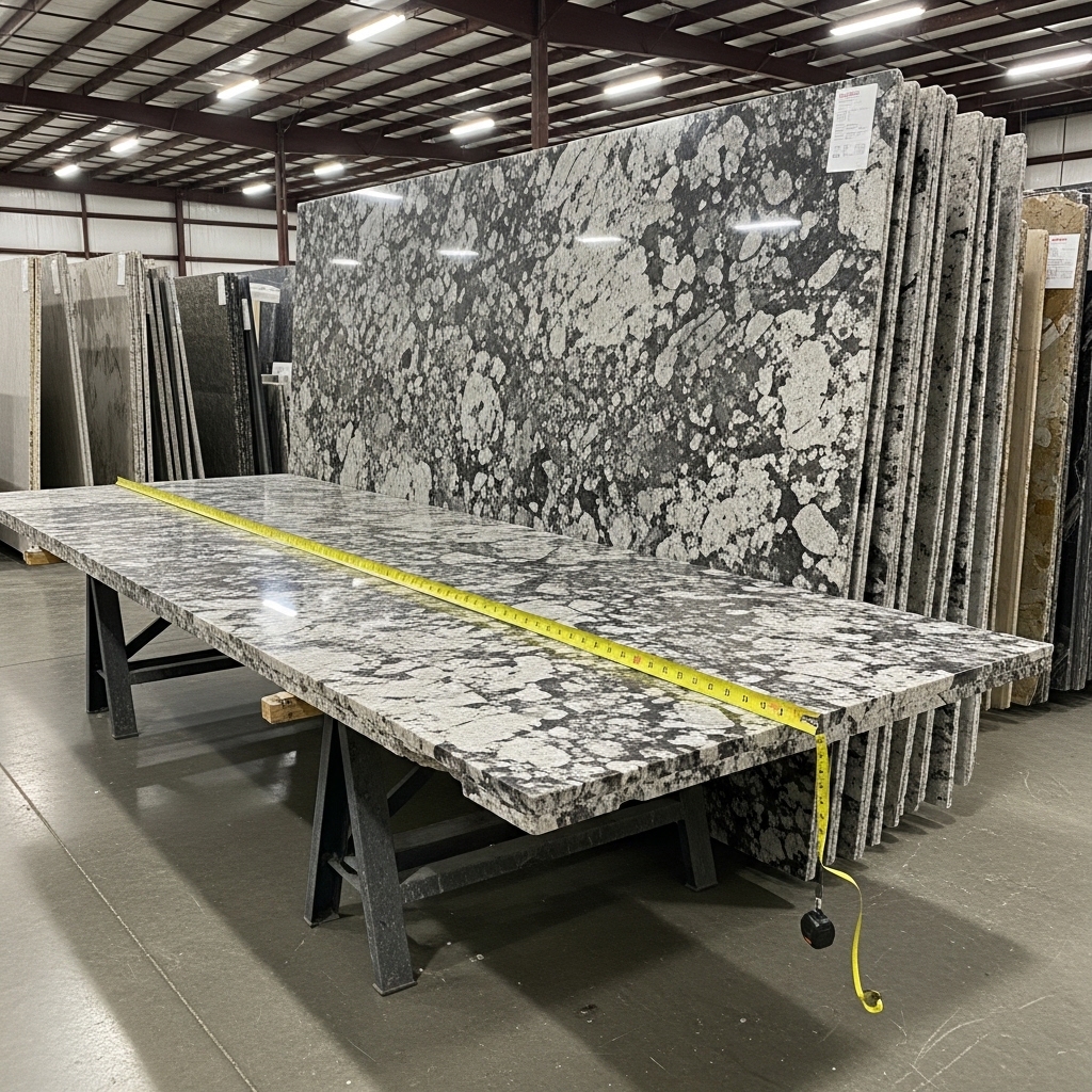 Natural stones like granite and quartzite are often supplied in slab ranges such as 2400–3300 mm long and 1400–2000 mm wide (typical examples), while engineered quartz commonly appears in set large formats like 3000 × 1400 mm or 3200 × 1600 mm.