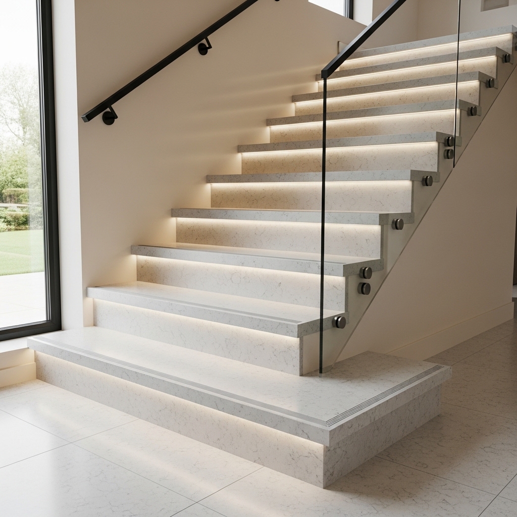 A quartz slab dimensions overview for stairs focuses on selecting slab formats that provide enough cutting flexibility for repeated treads, matching risers, and landing pieces while keeping seams minimal in focal zones.
