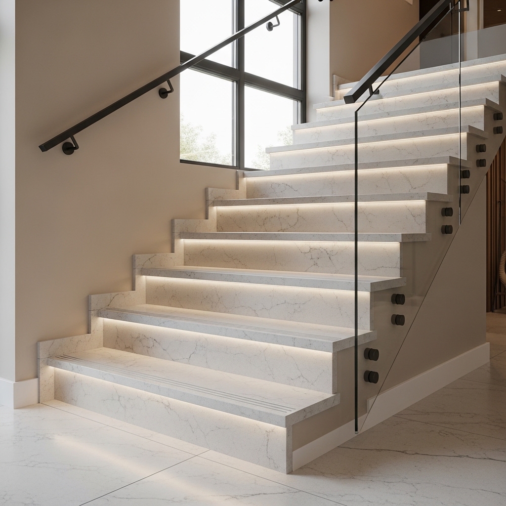 Stair treads are commonly specified around 20 mm thickness, and the step nose is typically eased or chamfered to reduce chipping risk over time.