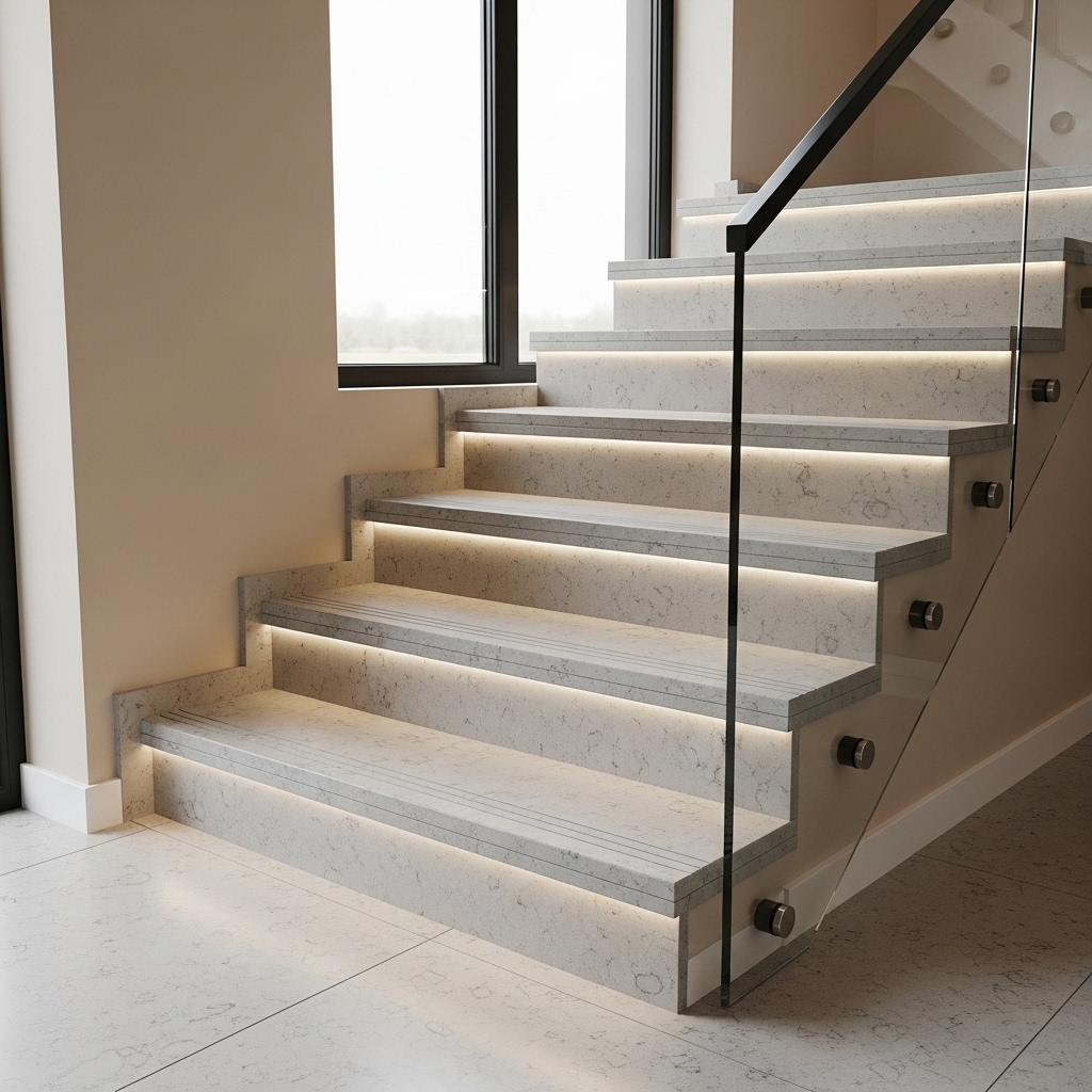 A quartz slab sizing guide for stairs is about matching slab format to the stair geometry so the most visible areas—especially landings and turning steps—stay as continuous as possible.